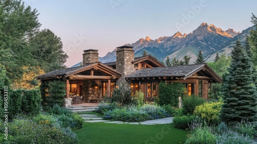 Fototapeta premium A rustic log cabin with a stone fireplace and a beautiful garden sits in front of a mountain range at sunset.
