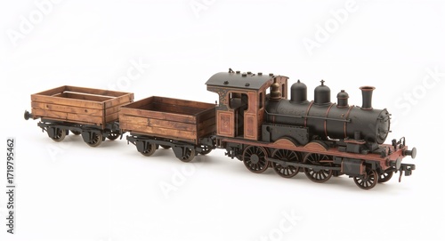 © Arceli, Obraz premium A rustic narrow gauge train with wooden wagons small iron wheels and compact steam engine on plain white background