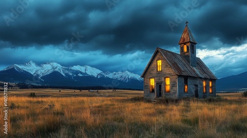 © Jam, Fototapeta premium A rustic, old church glows gently with warm light as storm clouds gather over the expansive Montana plains and distant mountains