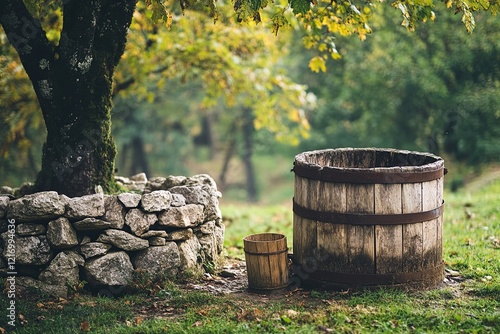 © adobestocker1, Fototapeta premium A rustic outdoor well with a single wooden bucket resting beside it. picture