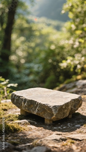 © Piyapong, Fototapeta premium A rustic, rectangular stone slab elevated on a mossy forest floor, with a blurred natural green background.