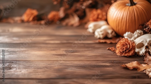 Fototapeta premium A rustic scene featuring a pumpkin surrounded by floral elements and dried leaves, capturing the essence of a cozy autumn and Halloween atmosphere vividly.