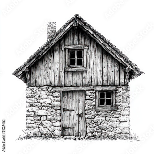 © LyceeChee, Obraz premium A rustic stone and wood cabin stands alone against a white background.