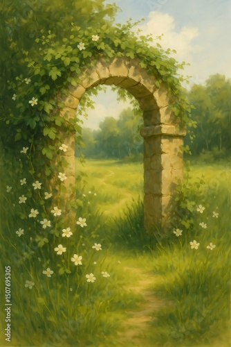 © Luminora Studio, Obraz premium A rustic stone archway covered in vines and white wildflowers opens to a sunlit grassy field bordered by forest
