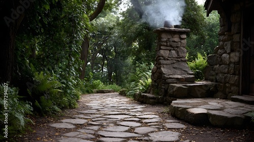 Obraz premium A rustic stone chimney with smoke rises beside a winding flagstone path through a lush green forest