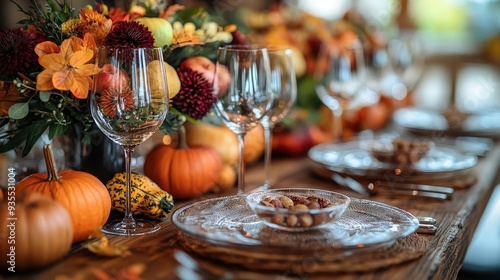 Naklejka premium A rustic table setting with autumnal decorations, perfect for a seasonal...