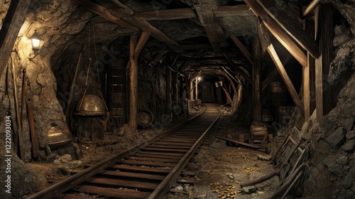 Naklejka premium A rustic, underground gold mine tunnel with old tracks, wooden beams, and...