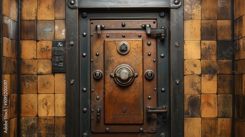 © aicandy, Fototapeta premium A rustic, vintage-style bank vault door with a detailed design and weathered finish, surrounded by an array of old, patterned tiles