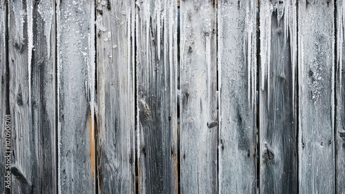 Naklejka premium A rustic, weathered wooden plank background with subtle frosty edges and icicles, perfect for evoking cozy cabin vibes with a winter twist.