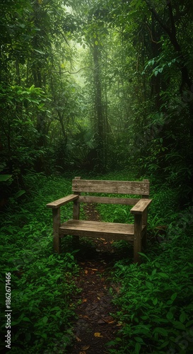 © PHOUVONG , Fototapeta premium A rustic, weathered wooden seating structure stands quietly amidst dense, humid, and vibrant green rain forest vegetation under diffused light ,jungle path ,daylight ,dense