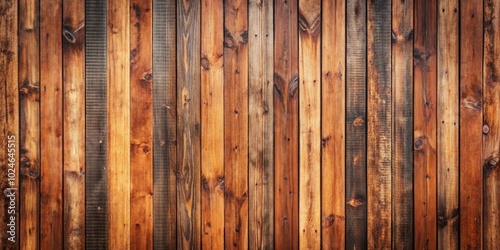 © Theerawat, Naklejka premium A rustic wood panel wall with planks in various shades of brown and dark brown, creating a natural and textured background.