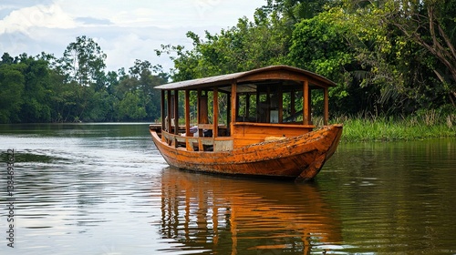 Fototapeta premium A rustic wooden boat floats on a serene green river
