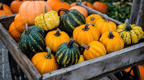 Obraz premium A rustic wooden cart filled with pumpkins, squash, and gourds