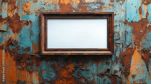 © Vector_Collections, Naklejka premium A rustic wooden frame against a vibrant, peeling wall, showcasing the beauty of decay and color contrast.
