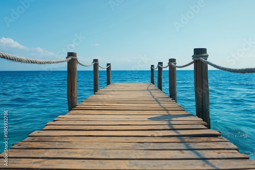 Naklejka premium A rustic wooden pier stretches out towards the serene, azure sea, creating a...