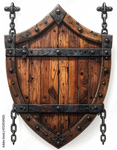 © Bambang, Fototapeta premium A rustic wooden shield, vertically oriented, with iron bands, rivets, and hanging chains. The wood shows age and texture