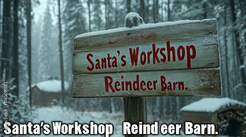 Obraz premium A rustic wooden sign pointing toward "Santa's Workshop" and Reindeer Barn.