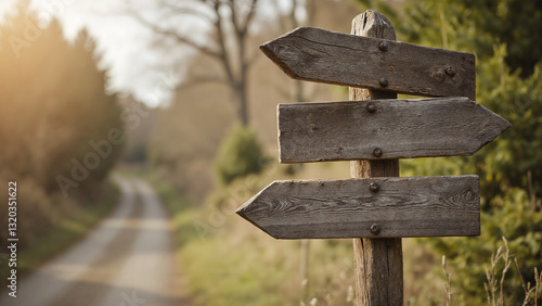 © YB Creative, Naklejka premium A rustic wooden signpost with three arrow-shaped planks pointing in different directions, against a blurred landscape.