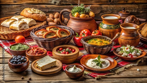 Fototapeta premium A rustic wooden table adorned with an array of traditional dishes, including savory pastries, creamy soups, and fresh herbs, creating a symphony of flavors and textures.