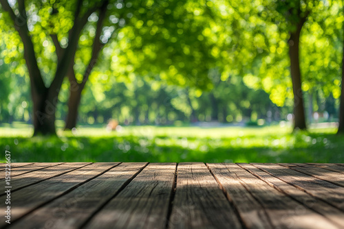 © Aisyaqilumar, Fototapeta premium A rustic wooden table in focus with a blurred background of a serene park filled with vibrant green trees and sunlight filtering through.