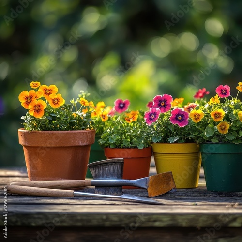Obraz premium A rustic wooden table is adorned with numerous colorful pots of vibrant flowers and various gardening tools.