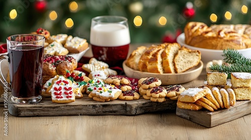 © Preecha, Naklejka premium A rustic wooden table laden with an assortment of homemade holiday treats, including decorated cookies, spiced mulled wine, and artisanal bread, all beautifully highlighted against a blurred, festive