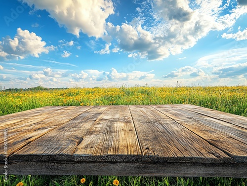© Salman, Fototapeta premium A rustic wooden table sits in a vibrant field of yellow wildflowers under a bright sunny sky Perfect for showcasing products or creating a summery mood