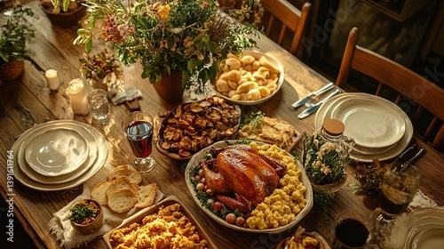 Naklejka premium A rustic wooden table with a delicious Thanksgiving spread, featuring turkey, sides, and gravy