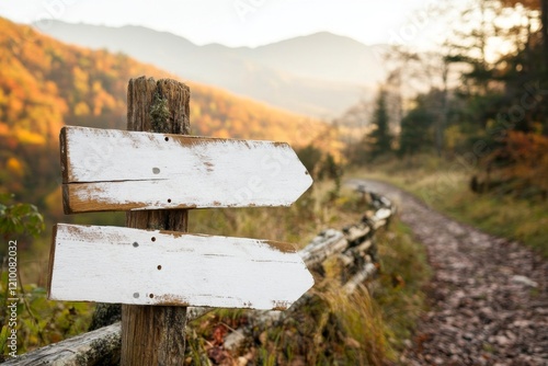 © Thanyarat, Naklejka premium A rustic yield sign created from recycled pallet wood, positioned along a forested trail with dappled sunlight