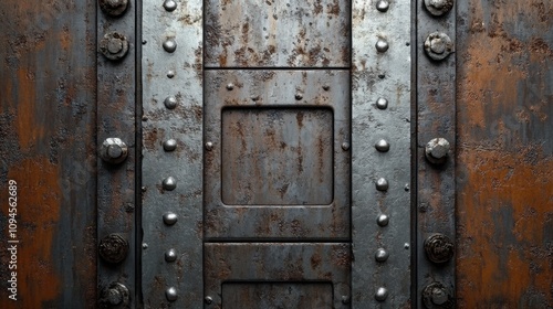 Fototapeta premium A rusty metallic door with rivets and a rectangular window, suggesting...