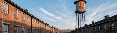 © Eing, Fototapeta premium A Rusty Water Tower Stands Tall Against a Row of Brick Buildings, Their Windows Gazing Upward Towards the Open Sky.