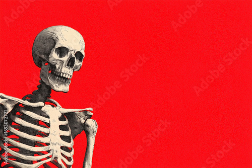 Fototapeta premium a 1950s advertising illustration of a skeleton on red background, room for...