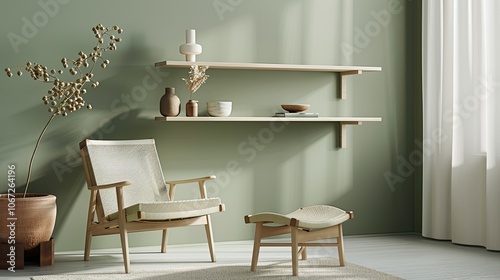 Fototapeta premium A sage green wall with a shelf and chair, pastel colors