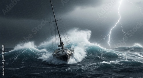 Fototapeta premium A sailboat battles a ferocious storm at sea, lightning illuminates the...