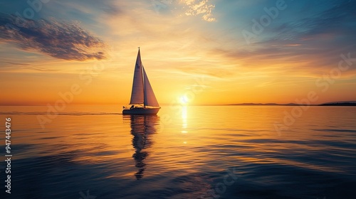 © Theeranan, Fototapeta premium A sailboat gliding on tranquil waters at golden hour, with its silhouette outlined against a glowing sunset.