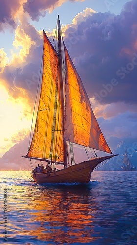 © Pandi, Fototapeta premium A sailboat gracefully sails on a body of water at sunset