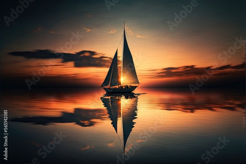 © Anna, Fototapeta premium a sailboat is sailing in the water at sunset with the sun setting in the background and clouds in the sky above it, and a reflection of the water. generative ai