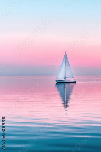 © Sea Lily, Obraz premium A sailboat on calm water under a pastel sky. The serene scene reflects tranquility and minimalism, evoking a sense of peace and adventure on the open sea.