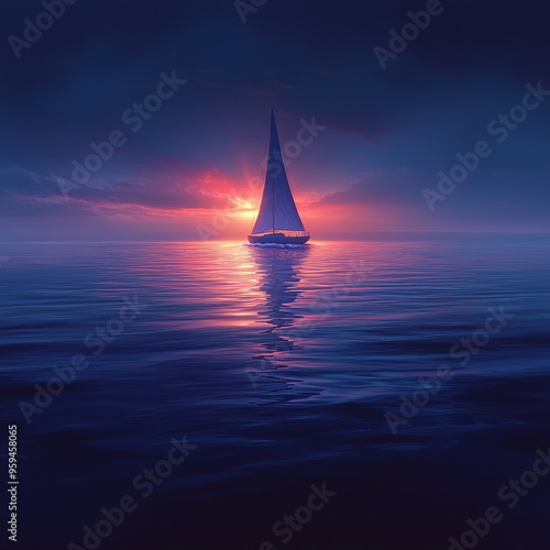 Fototapeta premium A sailboat sails towards the horizon, its white sails catching the last rays...
