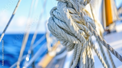 Obraz premium A sailing boat's rigging and ropes, coastal setting with clear blue sea, Nautical style