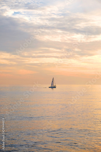 © Gill, Fototapeta premium A sailing boat silhouetted in a calm seamless orange glowing sea