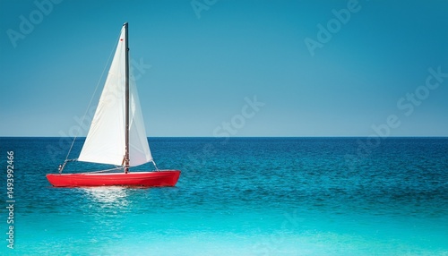 © Erica, Fototapeta premium a sailing dinghy standing in turquoise water background small dinghy in the water banner red sailboat background sail boat poster sailboat watercraft on sea banner