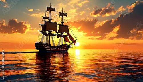 Fototapeta premium A sailing ship is silhouetted against a vibrant sunset over calm water,...