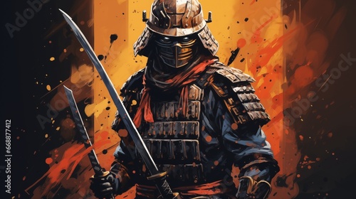 Fototapeta premium a samurai in armor and holding two swords. Fantasy concept , Illustration painting.