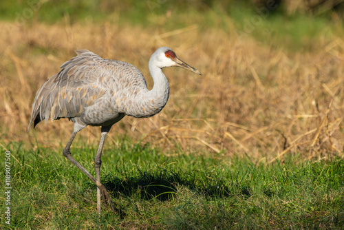 © Gordon, Obraz premium A Sandhill Crane feeding in a grass field