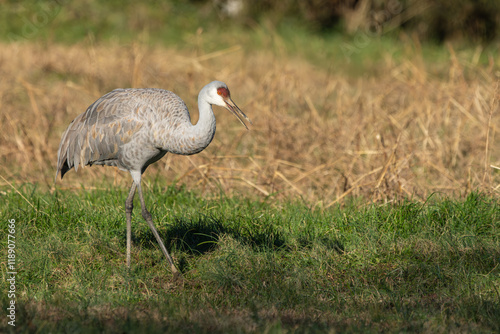 © Gordon, Naklejka premium A Sandhill Crane feeding in a grass field