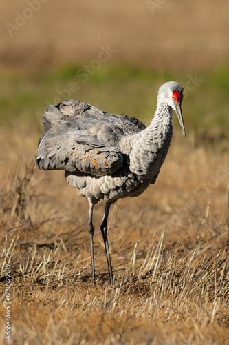 Obraz premium A Sandhill Crane shakes its tail feathers in an agriculutre field