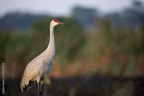 Naklejka premium A Sandhill Crane stands tall in green grass with a smooth textured background of green marsh grasses.