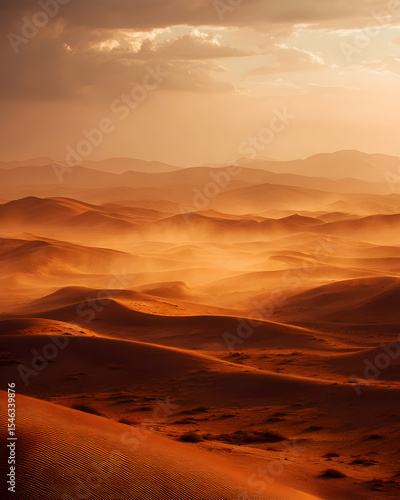 © sajawal, Naklejka premium A sandstorm sweeping across desert dunes under an orange sky -