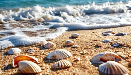 © Deamard, Obraz premium A sandy beach with shells and waves rolling in.
